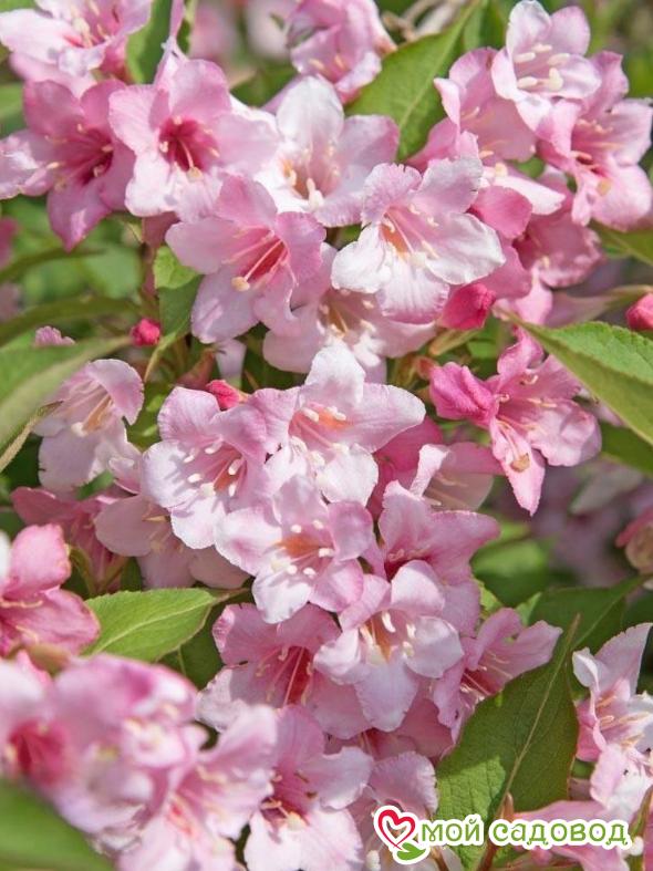 Вейгела Розеа (Weigela florida Rosea) —  гибрид между вейгелой цветущей и вейгелой корейской. Раскидистый кустарник до 2м высотой и до 2,5м шириной. Цветки очень крупные  с колосовидным отгибом, розовые, слегка пестрят белым, обильно появляются на кусте в июне месяце. Листья светло-зеленого цвета, осенью краснеют. Этот сорт зимует лучше всех других, ему требуется лишь небольшое укрытие листом.  Любит солнечные места, плодородные дренированные почвы.   Уход за растением:  Саженцы вейгелы нужно сажать в плодородную, воздухопроницаемую почву. Сразу учитывайте, что место постоянное, так как пересадить массивный куст с пышной кроной даже при желании будет практически невозможно. Для того, чтобы растение выглядело аккуратно, его нужно стричь, удаляя больные и поврежденные ветки и формируя крону так, как вам это нужно. В первый сезон кустарник нуждается в регулярном поливе, затем вейгелу поливают только при длительных засухах.